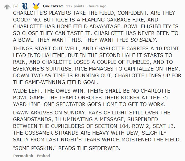 Rice fan spins a tale of their upcoming game vs Charlotte: #TrashTalk #RICEvsCHAR pic.twitter.com/KDctIny6RA— RedditCFB (@RedditCFB) November 10, 2016